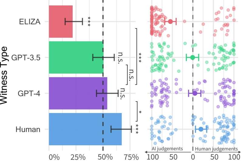 加州大學圣地亞哥分校的研究人員招募了 500 名參與者,讓他們與四位“對話者”進行五分鐘的交流,這四位“對話者”分別是真人、上世紀 60 年代的初代聊天機器人 ELIZA、以及驅動聊天機器人 ChatGPT 的 GPT-3.5 和 GPT-4。參與者在對話結束后需判斷對方是人還是機器。
