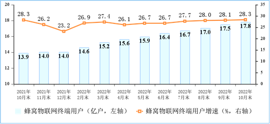此外,“物超人”步伐持續加大,IPTV用戶穩步增長。截至10月末,三家基礎電信企業發展蜂窩物聯網終端用戶17.77億戶,比上年末凈增3.79億戶;已超移動電話用戶數9482萬戶,占移動網終端連接數(包括移動電話用戶和蜂窩物聯網終端用戶)的比重已達51.4%。IPTV(網絡電視)總用戶數達3.74億戶,比上年末凈增2532萬戶。