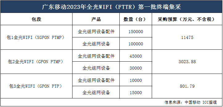 根據(jù)此前招標(biāo)公告,廣東移動2023年全光WIFI(FTTR)第一批終端采購預(yù)算金額為15300.67萬元(不含稅),其中標(biāo)包一:全光WIFI(XGPON PTMP),預(yù)算不含稅11,475.00萬元;標(biāo)包二:全光WIFI(GPON PTMP),預(yù)算不含稅3,023.88萬元;標(biāo)包三:全光WIFI(GPON PTP),預(yù)算不含稅801.79萬元。