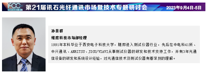 孫景群 1991年本科畢業于西安電子科技大學,隨即進入測試儀器行業,先后在中電科41所、中興通訊、ANRITSU、JDSU/VIAVI從事測試儀器的研發和技術支持工作,并有3年光通信設備的研發和系統設計經驗,對光通信技術及測試儀器有著深刻的理解。