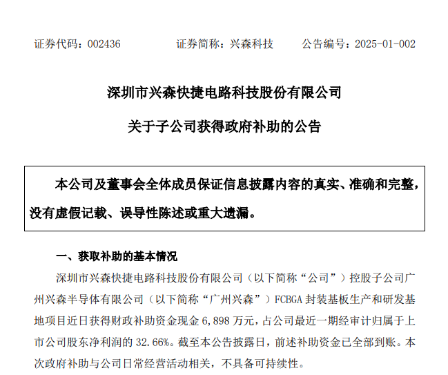 ICC訊 1月7日晚間,深圳市興森快捷電路科技股份有限公司(簡稱“興森科技”或“公司”,002436)發(fā)布關(guān)于子公司獲得政府補(bǔ)助的公告,公司控股子公司廣州興森半導(dǎo)體有限公司FCBGA封裝基板生產(chǎn)和研發(fā)基地項目近日獲得財政補(bǔ)助資金現(xiàn)金6898萬元。此次政府補(bǔ)助預(yù)計增加公司2024年度利潤總額6898萬元,對凈利潤影響約為2710萬元。
