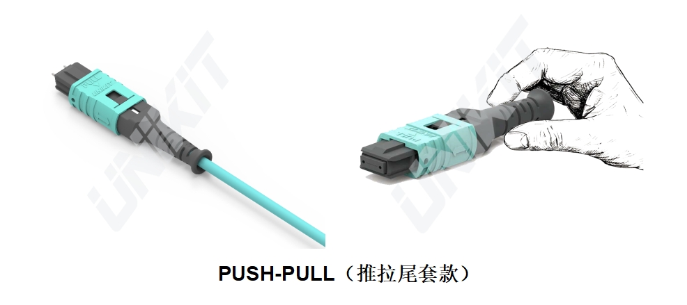 1、推拉尾套式MPO連接器:標準MPO尺寸實現推拉尾套裝拆功能,更適應高密度場景。
