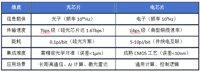 光芯片與電芯片的本質差異體現在信息載體、能耗與應用場景等幾個方面。光子以101?Hz頻率傳輸,支持Tbps級速率且能耗低至0.1pJ/bit;而電子受限于109Hz 頻率,速率與能耗均處于劣勢。這種差異決定了光芯片在長距離通信、AI計算等場景的不可替代性,而電芯片則在通用計算、控制邏輯等領域持續發揮價值。