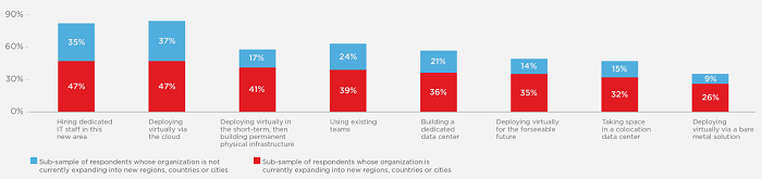 Equinix表示,持續不斷的供應鏈挑戰催生了更多的虛擬化需求,企業正在計劃對數字基礎設施進行大量投資。在美國,超過三分之一(34%)的IT決策者計劃通過虛擬云部署來促進全球擴張計劃。總體而言,73%的美國受訪者表示,他們的組織正計劃向新的城市、國家或地區進行全球擴張。