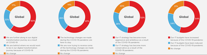 大流行還對企業的數字戰略產生了重大影響,因為46%的美國IT領導者計劃因COVID-19而加速其公司的“數字化發展”。IT部門正在經歷大流行帶來的一些積極結果——54%的人表示,他們的IT預算增加是大流行的直接結果。此外,57%的人預測,在大流行期間實施的技術變革和投資將在可預見的未來保持不變。