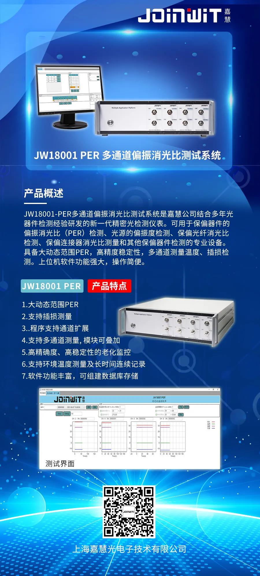 JW18001-PER多通道偏振消光比測試系統是嘉慧公司結合多年光器件檢測經驗研發的新一代精密光檢測儀表。可用于保偏器件的偏振消光比(PER)檢測、光源的偏振度檢測、保偏光纖消光比檢測、保偏連接器消光比測量和其他保偏器件檢測的專業設備。具備大動態范圍PER,高精度穩定性,多通道測量溫度、插損檢測。上位機軟件功能強大,操作簡便。
