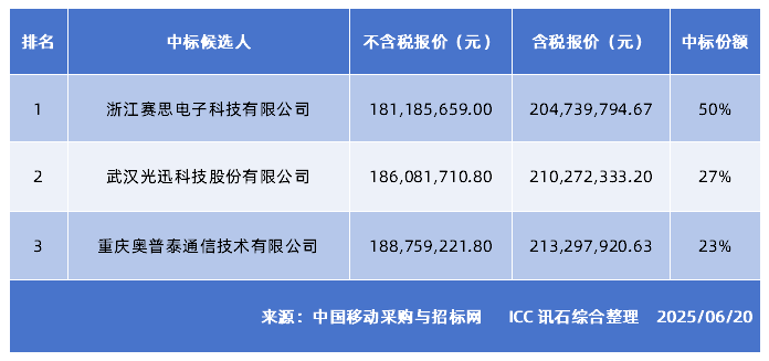 ICC訊 2025年 6 月 20 日,中國移動于采購網(wǎng)發(fā)布了《2025年至2027年同步網(wǎng)設(shè)備集中采購項(xiàng)目中標(biāo)候選人公示》。浙江賽思電子、武漢光迅科技、重慶奧普泰通三家廠商中標(biāo)入選。