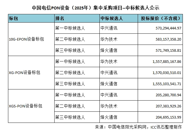 ICC訊 2025年6月13日,中國電信發布PON設備(2025年)集中采購項目(項目編號:I1100000755723207001)候選人公示。采購包括三個標包:10G-EPON設備、XG-PON設備和XGS-PON設備。中興通訊、華為技術和烽火通信分別都中標三個設備標包,詳細排名及投標報價如下: