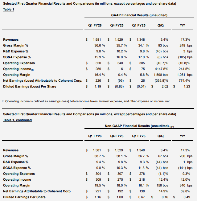ICC訊 2025年11月5日,Coherent Corp. 公布其2026財年第一季度財務業績。截至2025年9月30日,公司營收為15.8億美元,GAAP毛利潤率為36.6%,GAAP凈收入為每股攤薄收益1.19美元。在非GAAP基礎上,毛利潤率為38.7%,每股攤薄收益為1.16美元。