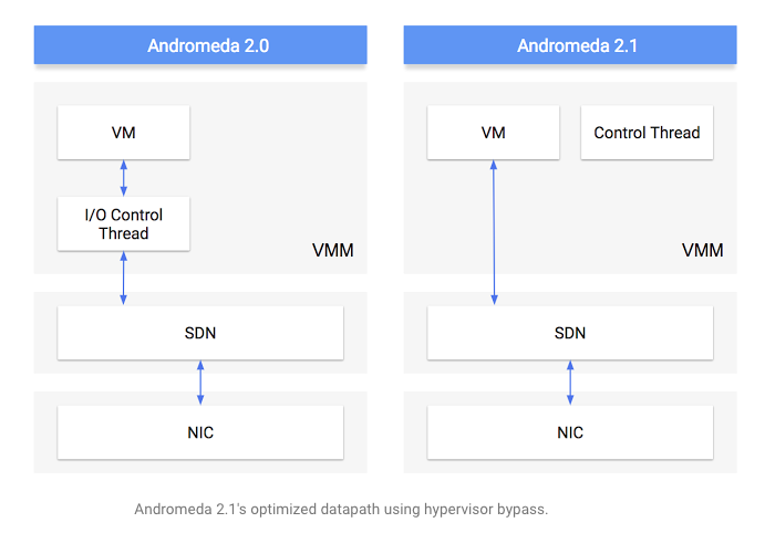 Andromeda 2.1延遲的改進來自于虛擬機管理程序旁路,其基于virtio,即網絡和磁盤設備驅動程序的Linux半虛擬化標準。Google Cloud軟件工程師Jake Adriaens今天在一篇博客中寫道:“Andromeda 2.1增強功能使計算引擎客機虛擬機和Andromeda軟件交換機能夠通過共享內存網絡隊列進行通信,從而完全繞過虛擬機管理程序,實現對性能敏感的數據包操作。”