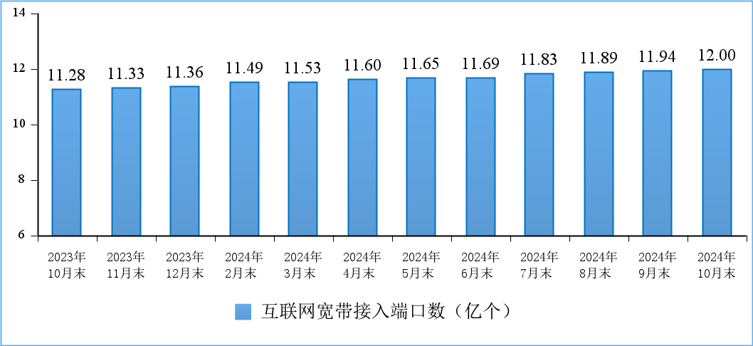 截至10月末,全國互聯網寬帶接入端口數量達12億個,比上年末凈增6370萬個。其中,光纖接入(FTTH/O)端口達到11.6億個,比上年末凈增6141萬個,占互聯網寬帶接入端口的96.4%。截至10月末,具備千兆網絡服務能力的10G PON端口數達2761萬個,比上年末凈增458.6萬個。截至10月末,5G基站總數達414.1萬個,比上年末凈增76.4萬個,占移動基站總數的32.8%,占比較上年末提高3.7個百分點。