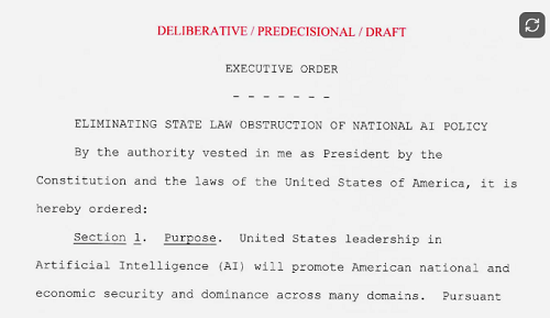 這項題為"消除州法律對國家級人工智能政策的阻礙"(Eliminating State Law Obstruction of National AI Policy)的草案命令指出,為了贏得全球人工智能競賽,美國公司必須能夠自由創(chuàng)新,而不受各州對技術(shù)各方面制定的一系列法規(guī)的束縛。草案指出,加利福尼亞州和科羅拉多州已經(jīng)實(shí)施了限制人工智能的法律。草案稱,這種拼湊式的監(jiān)管框架將迫使所有人遵守限制最嚴(yán)的州的規(guī)定。