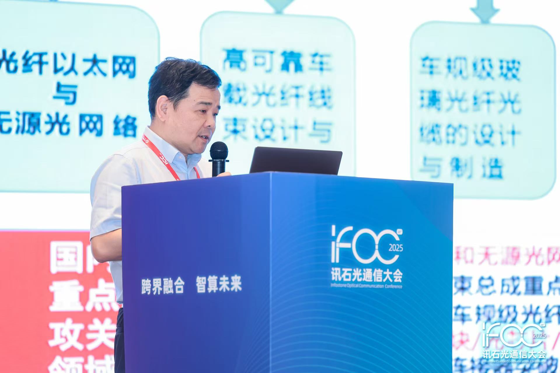 烽火通信技術(shù)研究中心總經(jīng)理羅文勇則在《車載光通信技術(shù)發(fā)展與展望》中,直面車載通信網(wǎng)絡(luò)的升級需求與中國產(chǎn)業(yè)機(jī)遇。他指出,智能網(wǎng)聯(lián)汽車的快速演進(jìn)使傳統(tǒng)銅纜在帶寬、重量、成本上的瓶頸日益凸顯,車載光纖通信成為破局關(guān)鍵;依托國內(nèi)光纖到戶的產(chǎn)業(yè)規(guī)模與技術(shù)優(yōu)勢,發(fā)展車載PON、推進(jìn)以V-PON為核心的“光進(jìn)銅退”方案具有重要現(xiàn)實(shí)意義。同時(shí),他還提出V-PON技術(shù)需突破車規(guī)級無源器件、光芯片研發(fā)等關(guān)鍵領(lǐng)域,并建議加強(qiáng)跨領(lǐng)域協(xié)作與標(biāo)準(zhǔn)統(tǒng)一。此外,其還分享了中國信科集團(tuán)的全棧技術(shù)布局,以及烽火通信聯(lián)合光迅、信科智聯(lián)等企業(yè)構(gòu)建“光-芯-網(wǎng)-端”生態(tài)的進(jìn)展,包括國內(nèi)首款Risc-V車規(guī)MCU芯片與車載PON系統(tǒng)原型的推出,凸顯中國企業(yè)在該領(lǐng)域的技術(shù)實(shí)力。