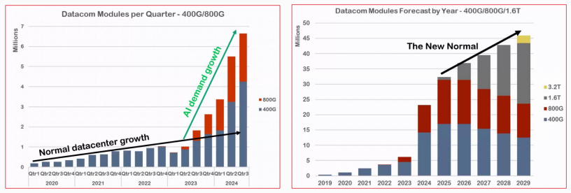 隨著AI模型快速迭代,全球光模塊市場迎來爆發(fā)式增長。2024年光模塊出貨量達(dá)2300萬只,400G與800G成為主力;預(yù)計400G將在2025年、800G在2026年達(dá)到峰值,而1.6T光模塊將從2026年起批量交付,3.2T光模塊預(yù)計2029年開始發(fā)貨。到2028年,400G及以上光模塊市場規(guī)模將突破180億美元。