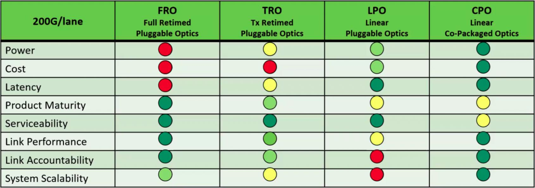 CPO與可插拔模塊對比:與其他光模塊形態(tài)對比,CPO在功耗、帶寬密度和時延控制方面具備顯著優(yōu)勢,適合未來高密度布線和大規(guī)模交換部署。然而,其產(chǎn)業(yè)鏈成熟度、生態(tài)兼容性及可維護(hù)性仍有待進(jìn)一步提升。相比之下,LPO(線性驅(qū)動可插拔光模塊)在功耗表現(xiàn)上達(dá)到當(dāng)前可插拔形態(tài)中的最佳,但面臨擴(kuò)展性受限的問題;TRO(發(fā)射端重定時模塊)則在系統(tǒng)兼容性、模塊責(zé)任界定和能效之間實現(xiàn)了更為均衡的技術(shù)權(quán)衡。