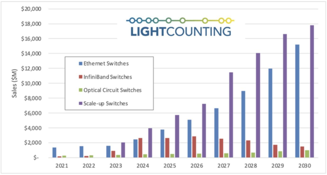 AI算力擴(kuò)張驅(qū)動下,Scale-Out架構(gòu)逐漸普及。據(jù)LightCounting預(yù)測,Ethernet交換機(jī)將在2025年超過IB交換機(jī),并在2030年占市場主導(dǎo)地位,光電路交換機(jī)(OCS)也展現(xiàn)出強(qiáng)勁增長勢頭。