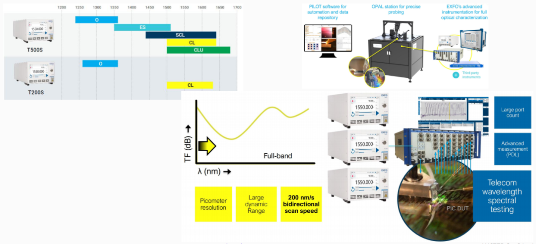 在光電子集成芯片測試方面:凌云光構(gòu)建了從研發(fā)驗證到量產(chǎn)的高精度測試體系。以EXFO PILOT自動化平臺為核心,結(jié)合OPAL探針臺、T500/T200掃頻光源及光譜分析系統(tǒng),實現(xiàn)對IL/RL/PDL、O波段光譜、掃頻響應(yīng)等參數(shù)的精準(zhǔn)測試,具備皮米級分辨率、雙向高速掃描與高通道并發(fā)能力,適用于硅光/InP等多平臺芯片的全波段分析。
