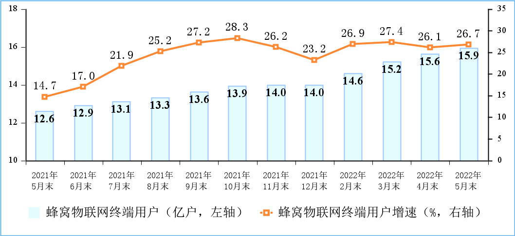 摘要:工信部發布2022年1—5月份通信業經濟運行情況。其中提到,移動網絡連接終端中物聯網用戶占比近半,IPTV用戶穩步增長。截至5月末,三家基礎電信企業發展蜂窩物聯網終端用戶15.9億戶,比上年末凈增1.96億戶。