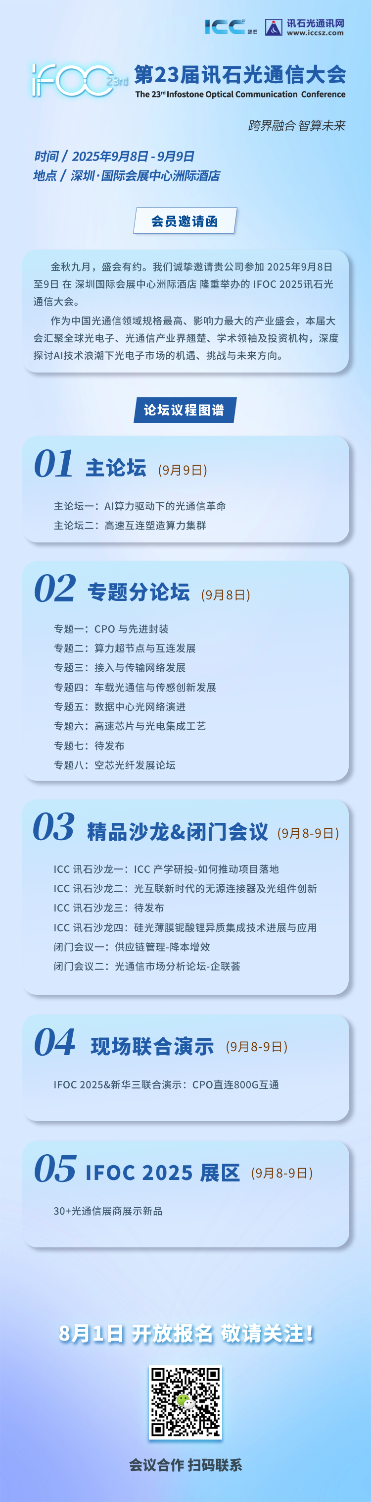 ICC訊 2025年9月8-9日,一年一度IFOC2025訊石光通信大會即將在深圳國際會展中心洲際酒店隆重舉辦。IFOC 2025定位中國光通信領域最高規格技術,市場,交流研討為一體的產業盛會,將攜手光電子、光通信產業界、學術界、投資界等合作伙伴,探索AI機遇趨勢中的光電子技術市場的機遇與挑戰,致力于成為光通信、光電子市場發展的風向標。