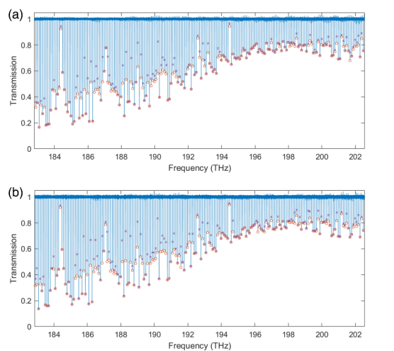 領先進口儀器與德力TLS1056激光器掃譜對比,測試器件為同一個微環諧振腔。(a) 進口儀器激光器掃譜;(b) 德力TLS1056激光器掃譜。