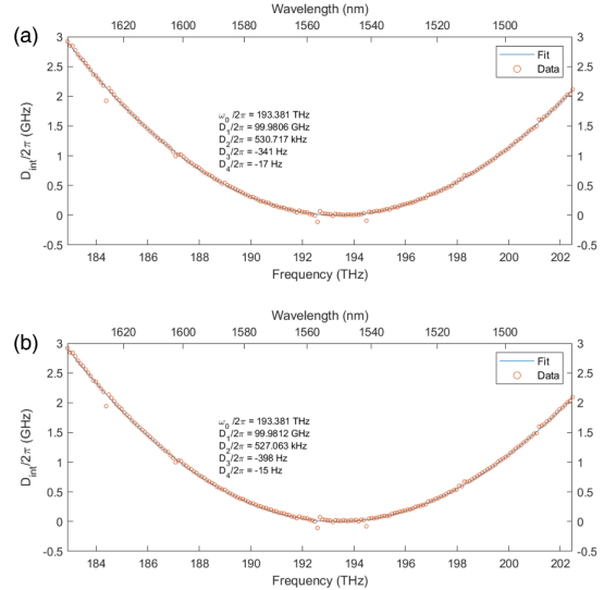 進口儀器與德力TLS1056激光器測得的微環諧振腔的色散對比,測試器件為同一個微環諧振腔。(a)進口儀器;(b) 德力TLS1056激光器。