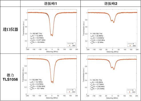 宏觀數據的一致性至關重要,但微觀細節更能考驗設備的性能。深國量院集成光學研究團隊進一步對比了所有諧振峰的透射譜線型。下圖展示了其中幾個具有代表性的諧振峰對比情況,可以清晰地看到,無論是諧振點的波長定位、譜線的深度與寬度,還是對稱性,TLS1056所測得的結果都與領先進口儀器的輸出保持了高度一致。這種在細微之處的一致性,充分證明了德力TLS1056激光器出色的光譜純度和掃頻穩定性。