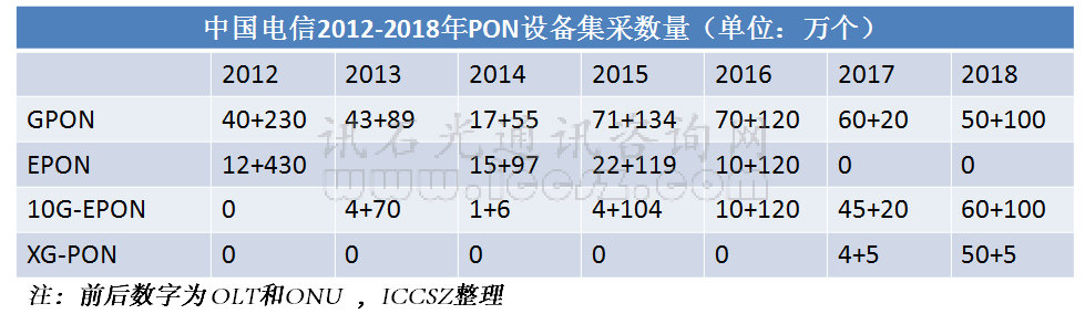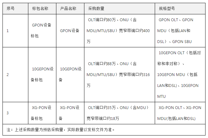 已知的是,2018年中國電信PON設備集采數量如下:①GPON設備標包采購OLT端口約50萬、ONU(含MDU/MTU/SBU)寬窄帶端口約100萬,規格型號包括GPON OLT、GPON MDU(包括LAN和DSL)、GPON SBU;②10GEPON設備標包,采購OLT端口約60萬、ONU(含MDU/MTU/SBU)寬窄帶端口約100萬,規格型號包括10GEPON OLT(包括對稱和非對稱)、10GEPON MDU(包括LAN和DSL)、10GEPON MTU;③XG-PON設備標包,采購的是OLT端口約50萬、ONU(含MDU)寬窄帶端口約5萬,規格型號有XG-PON OLT、XG-PON MDU(包括LAN和DSL)。