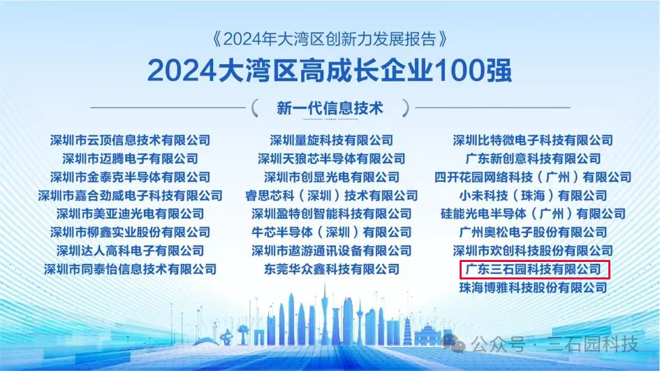 廣東三石園科技有限公司(以下簡稱“三石園科技”)憑借先進的技術、可靠的產品和優質的服務從“新一代信息技術”賽道脫穎而出,榮譽登榜“2024大灣區高成長企業100強”。