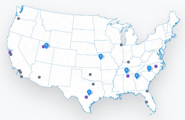 藍色標記代表Google Fiber已經接入的城市,主要有6個:普羅沃、 奧斯汀、堪薩斯、納什維爾、亞特蘭大和夏洛特 ;紫色圓圈代表即將完工的5個城市;灰色圓圈代表計劃接入的城市。從地圖上來看,東部是Google Fiber普及較高的區域,整個項目還處在初級普及狀態。