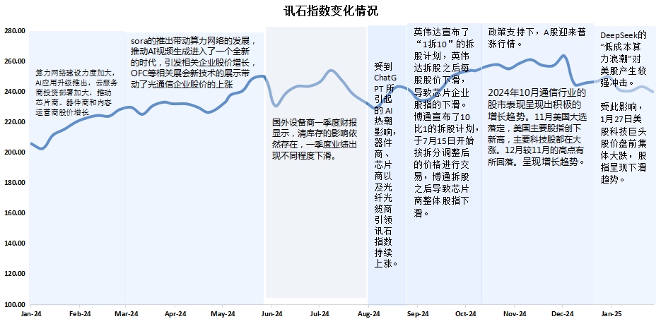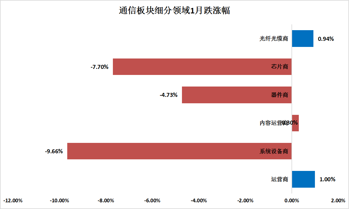 總體來看,1月通信行業(yè)股指呈現(xiàn)先增長后下滑趨勢(shì)。股指的波動(dòng)反應(yīng)了市場(chǎng)對(duì)光通信未來發(fā)展的樂觀預(yù)期,也受到短期資金流向和行業(yè)競(jìng)爭等因素的影響。
