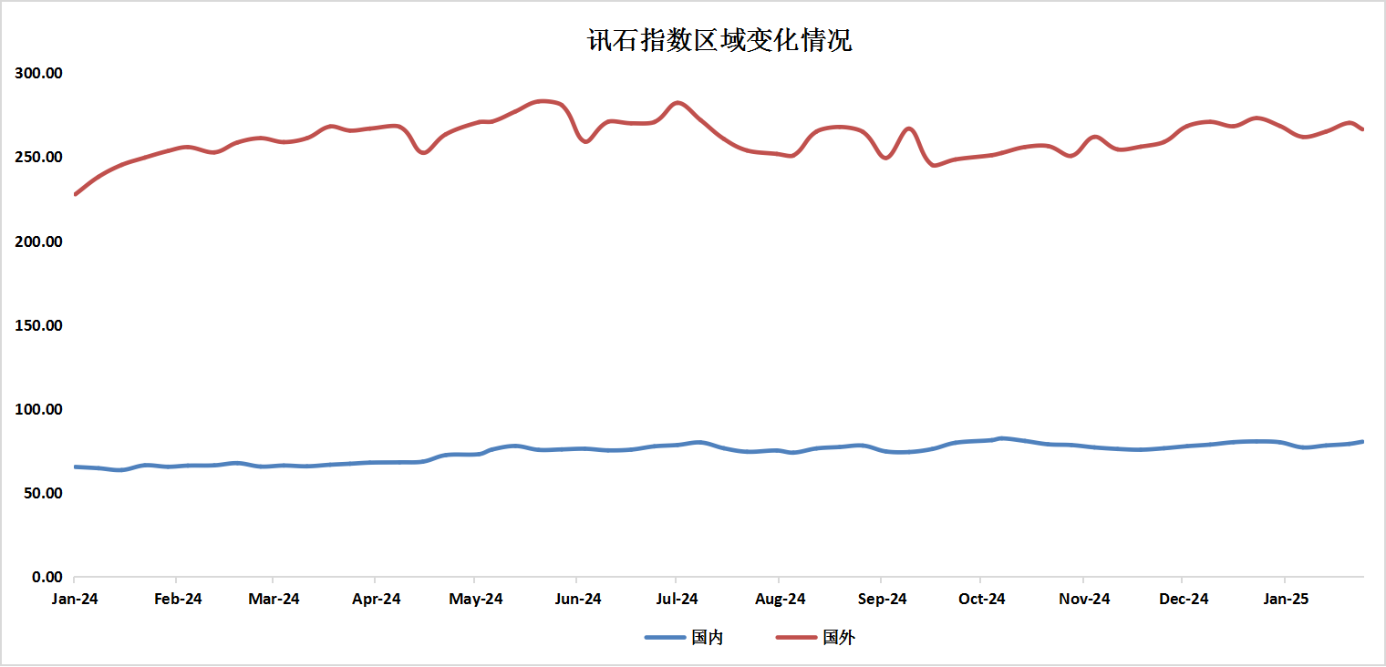 按地區(qū)劃分,截止到1月28日,ICC所統(tǒng)計(jì)的國內(nèi)通信指數(shù)為80.35,環(huán)比下滑0.24%。國內(nèi)指數(shù)呈現(xiàn)平穩(wěn)趨勢(shì)。國外通信指數(shù)為266.47,較上月下滑2.44%。國外通信股指在波動(dòng)中呈現(xiàn)下滑趨勢(shì)。