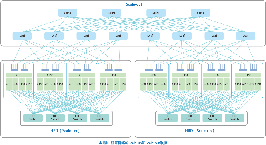 為了應對大模型參數規模的快速增長,可以把大模型分解為兩大類,分別處理(見圖1)。一類是需要在高頻度進行數據交互的,例如張量并行,把這些并行處理放置到GPU之間,通過超高帶寬、超低時延互聯的網絡進行處理,形成一個超節點,壓縮超節點內部GPU之間的通信開銷成本,這個網絡就是Scale-up網絡。Scale-up網絡是一個追求極致性能的互聯網絡,支持Load/ Store內存語義。另一類是將數據分解為相對獨立的并行任務,如流水線并行和數據并行,這個網絡就是Scale-out網絡。Scale-out網絡利用現有的Infiniband或RoCE網絡,支持消息語義。