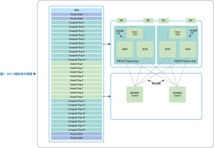 NVL72是英偉達推出的機柜級超節點,整個系統由18個Compute Tray和9個Switch Tray構成(見圖2)。1個Compute Tray包含2個GB200超級芯片(Superchip),每個GB200超級芯片有2個Blackwell系列的B200 GPU,整個機柜共72個Black- well GPU。同時每個Compute Tray提供4個網絡接口卡(NIC)用于Scale-out方向的擴展。1個Switch Tray包含2顆NVLINK Switch芯片,整個機柜提供18個NVLink Switch芯片。整機柜后部通過線纜將Compute Tray和Switch Tray進行互聯。