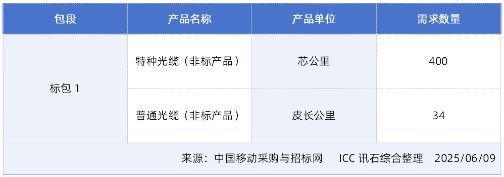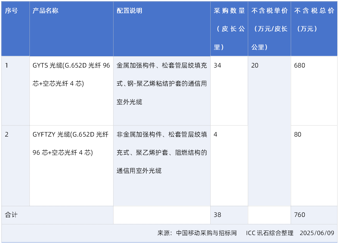 ICC訊 2025年6月7日,中國移動于采購網發布了《中國移動廣東公司2025年混合光纜(G.652D及空芯光纖)采購項目中標候選人公示》。本次集采規模為38皮長公里,不含稅單價限價20萬元/皮長公里,總價限價760萬元。長飛光纖光纜股份有限公司成功入選,成為本項目唯一候選廠商。