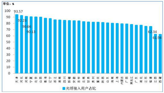 值得注意的是各省間光纖接入用戶占比差異呈縮小態勢,天津、河北、河南、寧夏和北京分別居全國前四位,占比均超過90%。