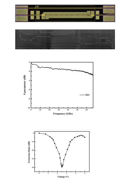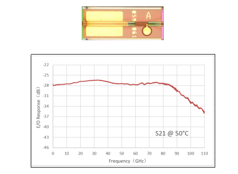 InP-MZM/IQ-MZI芯片:高電光帶寬+優驅動特性,強化信號調制性能:采用MMI+ MZM光學波導及CL-TWE電極方案,結合光波導優化制程工藝實現EO帶寬>67GHz,DCER>30dB,Vπ=2.1V 特性參數。降低驅動電路能耗,適配低功耗通信設備需求,為AI數據中心、5G承載網等場景提供高效調制解決方案。