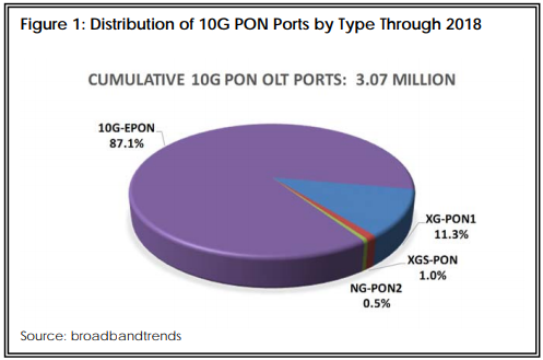 BBT數據顯示,截至2018年底,全球10G PON OLT端口出貨量約307萬,其中10G EPON占比高達87%,其次是XG-PON1占11%。10G EPON的商業出貨始于2012年,而XG-PON1始于2015年底--主要是亞太地區(特別是中國)。剩余的2%則是2016年底開始出貨的XGS-PON和2017年開始出貨的NG-PON2。