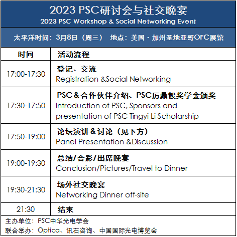 ICC訊 美國時間3月5日至9日,第48屆光纖通訊展覽會及研討會(OFC 2023)將在美國加州圣地亞哥會展中心舉辦。展會期間,PSC中華光電學會將舉辦其2023年度研討會與社交晚宴,時間:3月8日(周三),地點:OFC展館。