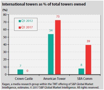 事實(shí)上,加上對(duì)Lightower的收購(gòu),Crown Castle這一系列激進(jìn)行為都意在支持對(duì)Small Cell連接的日益增長(zhǎng)的需求,但其主要競(jìng)爭(zhēng)對(duì)手如SBA通訊集團(tuán)和美國(guó)鐵塔公司進(jìn)入Small Cell市場(chǎng)的方式或許更加精妙。SBA和美國(guó)鐵塔開拓國(guó)外市場(chǎng)進(jìn)展順利,當(dāng)Crown Castle剝離澳洲鐵塔并使其100%資產(chǎn)在美國(guó)時(shí),SBA國(guó)際鐵塔占總鐵塔數(shù)的比例卻從2012年Q1的8%上升到2017年Q1的39%,美國(guó)鐵塔該數(shù)字同期也從54%上升到73%。