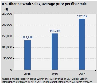 Kagan認(rèn)為在2015年-2017年間,平均每英里的光纖網(wǎng)絡(luò)價(jià)格年復(fù)合增長(zhǎng)率達(dá)31%,其中2015年的價(jià)格是13萬(wàn)美元,而2017年的價(jià)格在經(jīng)歷兩大交易后達(dá)到22.7萬(wàn)美元。Kagan分析了7個(gè)同類型交易案例,平均交易價(jià)格為每英里16.8萬(wàn)美元,而Crown Castle堪稱是光纖網(wǎng)絡(luò)最大“求婚者”,在這7個(gè)同類交易中占據(jù)了4個(gè)。