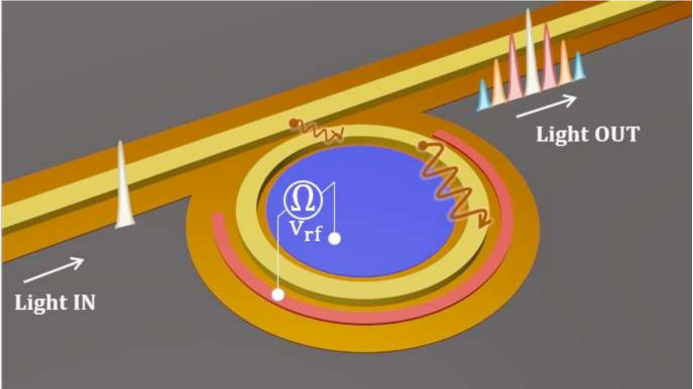 上圖是微環調制器(MRM)示意圖,顯示單頻光輸入經過調制獲得一系列邊帶光輸出。
