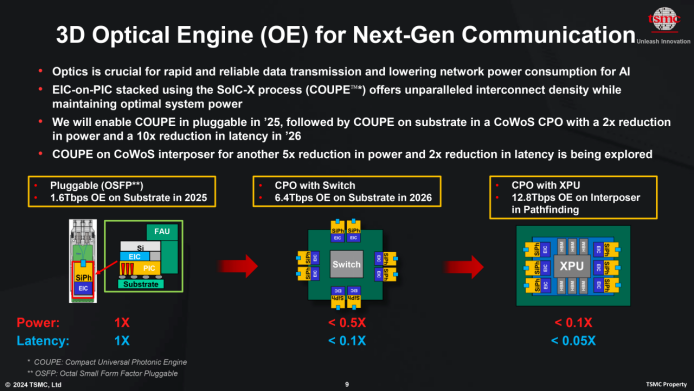 臺積電第一代3D光學引擎 (COUPE) 將集成到運行速度為1.6 Tbps的OSFP可插拔基板上,這一傳輸速率已經遠超當前銅纜以太網標準(最高800 Gbps),凸顯了光學互連對于網絡密集型計算集群的直接帶寬優勢,更不用說預期的節能效果了。看來TSMC的硅光技術開發進度比原計劃還要快。