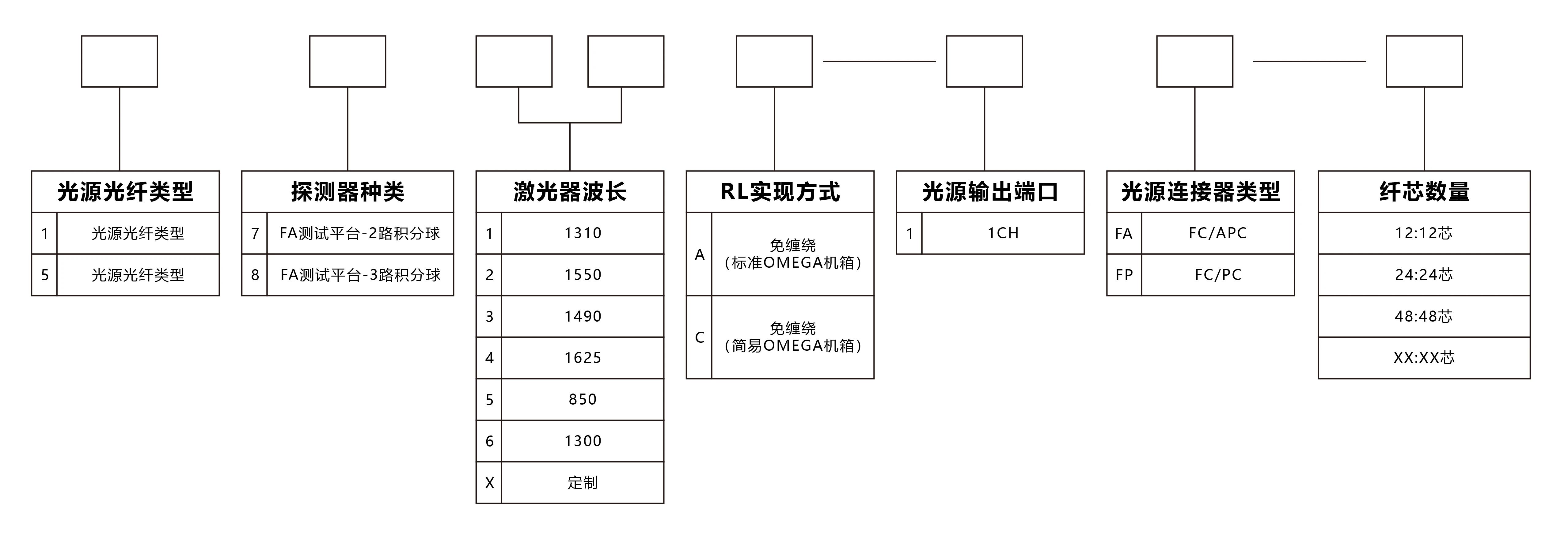 RL實(shí)現(xiàn)方式 A/C型號支持雙激光器波長,兩位數(shù)字編碼分別代表兩個(gè)激光器波長,客戶可在列表中選擇激光器波長或者定制激光器波長。