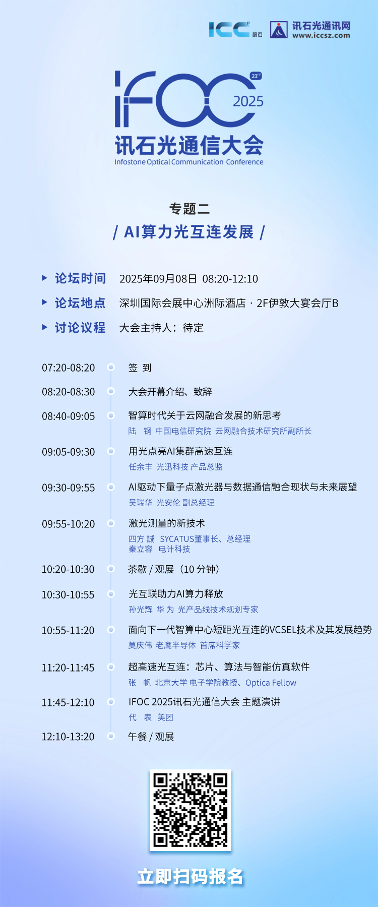 我們誠摯邀請光通信、云計算與算力網絡相關領域專業人士報名參會,共商未來技術演進與生態共建。請掃描二維碼完成會議報名。