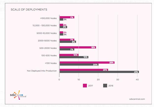 從部署規模上來看,大部分還是中小規模部署,500個節點以內的部署,16年占比76%,17年占比63%。不過17年的整體部署規模要大于16年。從下圖的數據可以看出,SDN的部署規模現在整體還不大,不過17年較16年有所提升,SDN的部署,正在從小規模實驗,逐漸走向大規模生產環境。