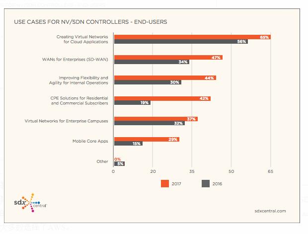 從應用領域來看,超過一半的用戶將SDN應用在云計算領域,排在第二位的應用是SD-WAN。應用比例17年較16年都有提升。