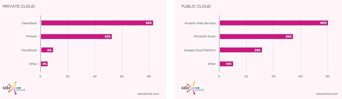 不論是部署規模還是應用比例,2017年比2016年都有所提升,這表明SDN在2017年里面,是處于一個正向發展的趨勢。而SDN的發展,得益于云計算和軟件定義數據中心(SDDC)的發展。接下來看看SDN產品與云平臺的集成情況。在被問及SDN期望與什么云平臺做集成時,私有云絕大多數選擇了OpenStack,而公有云絕大多數選擇了AWS。