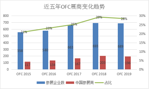 近五年OFC展商數(shù)量變化趨勢(shì)圖
