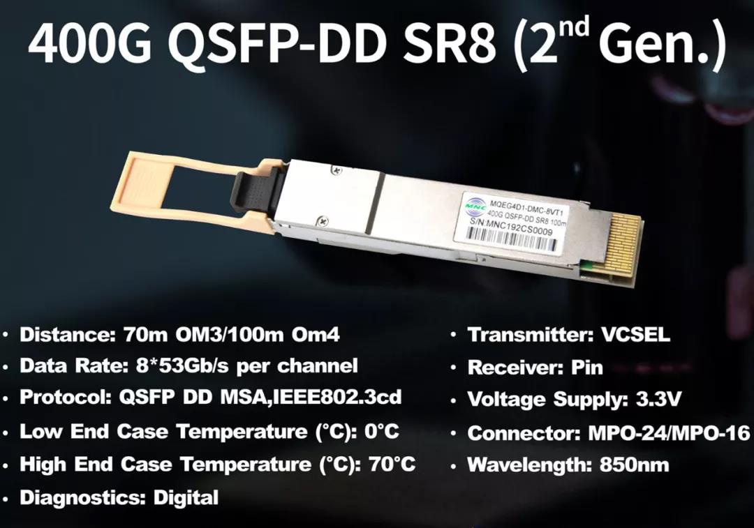 相對(duì)于我司在上一屆CIOE展會(huì)已發(fā)布亮相的400G SR8產(chǎn)品,于本屆光博會(huì)同期上市的第二代400GSR8產(chǎn)品。
