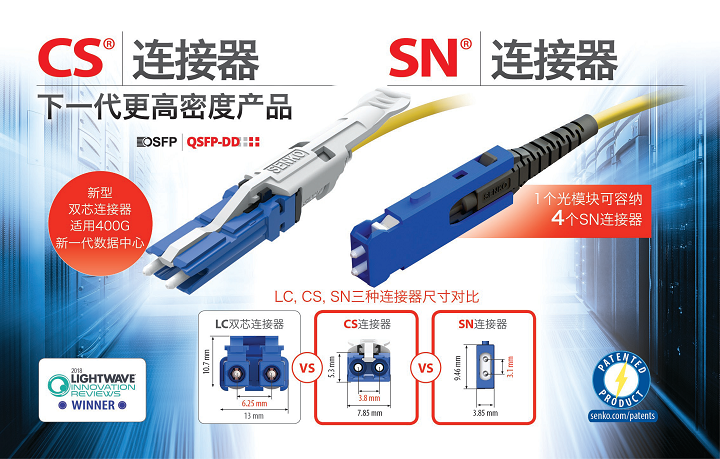 在CIOE 2018上,扇港重點(diǎn)展示了適用于400G新一代數(shù)據(jù)中心應(yīng)用CS連接器和能夠滿足高密度插拔條件,而對灰塵不敏感的高可靠性高使用壽命MPO連接器。扇港每年都投入大量的精力在研發(fā)上,今年光博會扇港推出了其新產(chǎn)品下一代更高密度產(chǎn)品SN連接器。這是一款新型雙芯連接器,適用于400G新一代數(shù)據(jù)中心,單個模塊可以容納4個雙芯連接器,與LC和CS連接器相比,SN連接器尺寸更小。